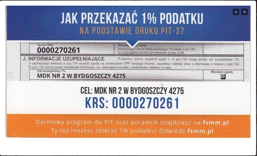 Pomimo trudnej sytuacji pragniemy by rok 2021 był satysfakcjonujący dla nas wszystkich, a w szczególności dla naszych Wychowanków. Wszystko, co się dotychczas wydarzyło i aktualnie dzieje w MDK 2 podporządkowane jest mądrej, kreatywnej i bezpiecznej pracy oraz opiece nad naszymi wychowankami. Doceniamy, że jesteście Państwo przy nas, ze swoim wsparciem, wyrozumiałością i pomocą. Doświadczyliśmy ze strony Państwa wielu ciepłych gestów, które przekładały się wielokrotnie na realną BEZINTERESOWNĄ POMOC. Za wszystko bardzo dziękujemy. Dzięki nawiązaniu współpracy z Fundacjami Młodzi Młodym i Partnerstwo udało się nam wprowadzić placówkę w obszar podmiotów, które można wspierać tym najsłynniejszym w Polsce 1%. Tą drogą pozyskujemy fundusze, które wspierają bieżące funkcjonowanie MDK-u. Dlatego też zwracamy się do Państwa z prośbą o rozważenie możliwości przekazania 1% ze swojego podatku na działalność dydaktyczną i organizacyjną placówki. Fundusze te w znaczący sposób mogą wzmocnić środki przeznaczone także na rozwój naszej bazy. Będziemy wdzięczni za zainteresowanie tą kwestią również Państwa otoczenia…więcej