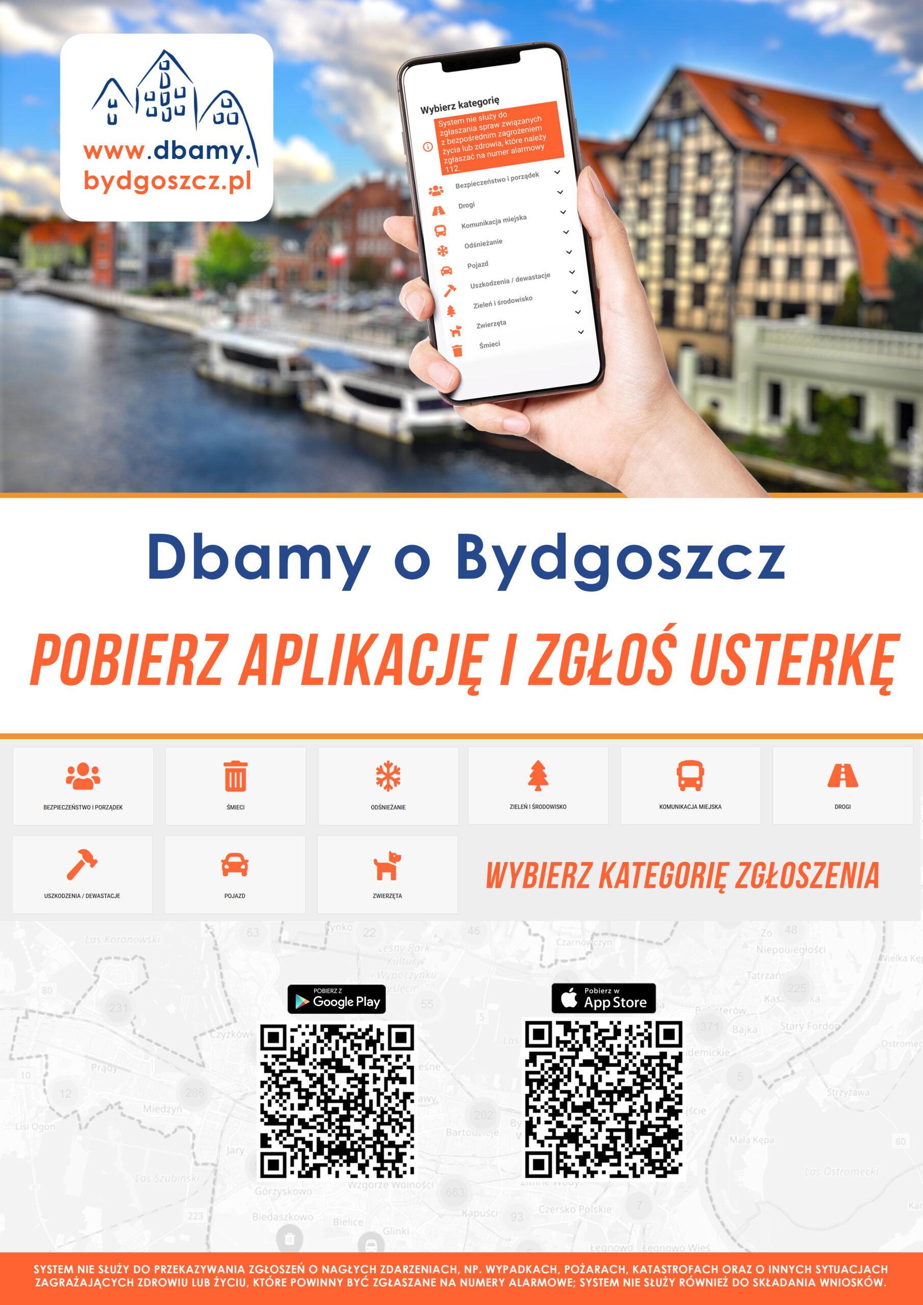 Aplikacja „Dbamy o Bydgoszcz” powstała z myślą o mieszkańcach, którzy chcą mieć realny wpływ na wygląd i funkcjonowanie swojego miasta. Dzięki niej w prosty sposób można zgłaszać różnego rodzaju interwencje – od nieprawidłowo zaparkowanych pojazdów, przez awarie oświetlenia ulicznego, po uszkodzenia jezdni, chodników czy ścieżek rowerowych. Z pomocą aplikacji można również przekazywać informacje o innych problemach, takich jak: dzikie wysypiska śmieci, niewidoczne lub uszkodzone znaki drogowe, utrudnienia dla osób z niepełnosprawnościami, nieporządek w przestrzeni publicznej. System Dbamy o Bydgoszcz składa się ze strony internetowej dbamy.bydgoszcz.pl oraz aplikacji mobilnych dostępnych na urządzenia z systemem Android i iOS. System dostępny jest w sklepie Google Play/App Store.