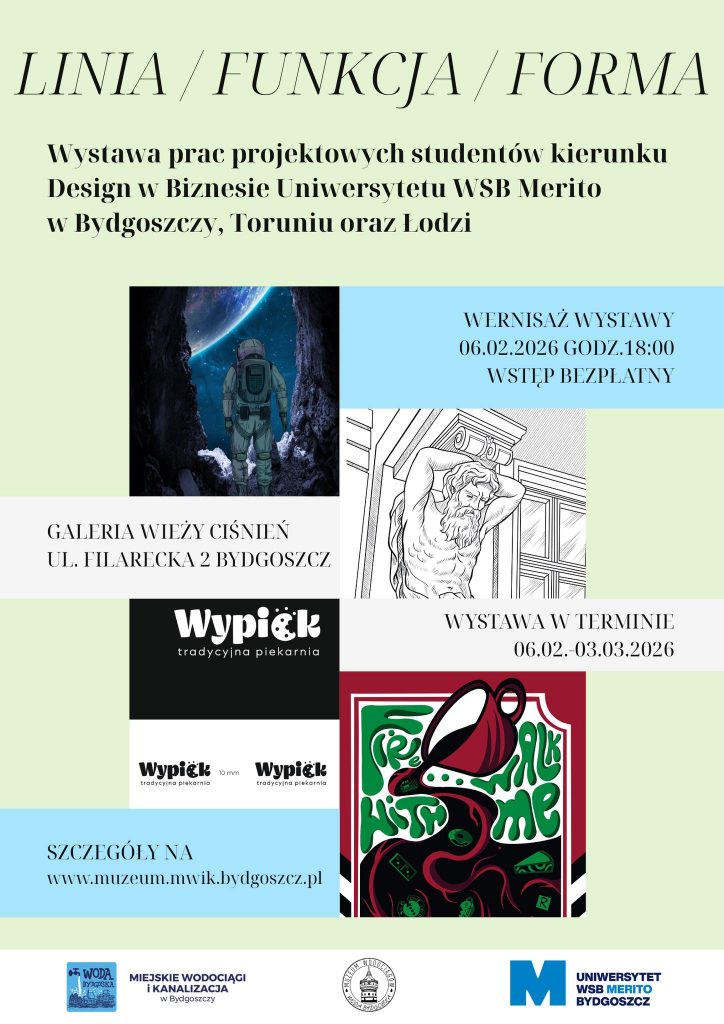 Zapraszamy na wyjątkową wystawę „Linia / Funkcja / Forma” w Galerii Wieży Ciśnień. Zobacz, jak studenci Designu w Biznesie z Uniwersytetów WSB Merito z Bydgoszczy, Torunia i Łodzi interpretują nowoczesne projektowanie w surowych wnętrzach dawnego zbiornika wodnego. Ekspozycja jest dostępna dla zwiedzających od 7 lutego do 3 marca 2026 r. w godzinach pracy Muzeum Wodociągów. Wystawa „Linia / Funkcja / Forma” stanowi wieloaspektowy przegląd dorobku projektowego studentów trzech roczników kierunku Design w Biznesie Uniwersytetu WSB Merito, reprezentujących wydziały w Bydgoszczy, Toruniu oraz Łodzi. Prezentowany zbiór prac realizowanych na różnych etapach studiów licencjackich, ukazuje ewolucję od warsztatowych ćwiczeń, po zaawansowane koncepcje semestralne, które wspólnie tworzą fundament kształcenia na tym unikatowym profilu studiów. Istotą prezentowanych dokonań jest symbioza tradycyjnych metod artystycznych z nowoczesnym instrumentarium cyfrowym…więcej (kliknij)