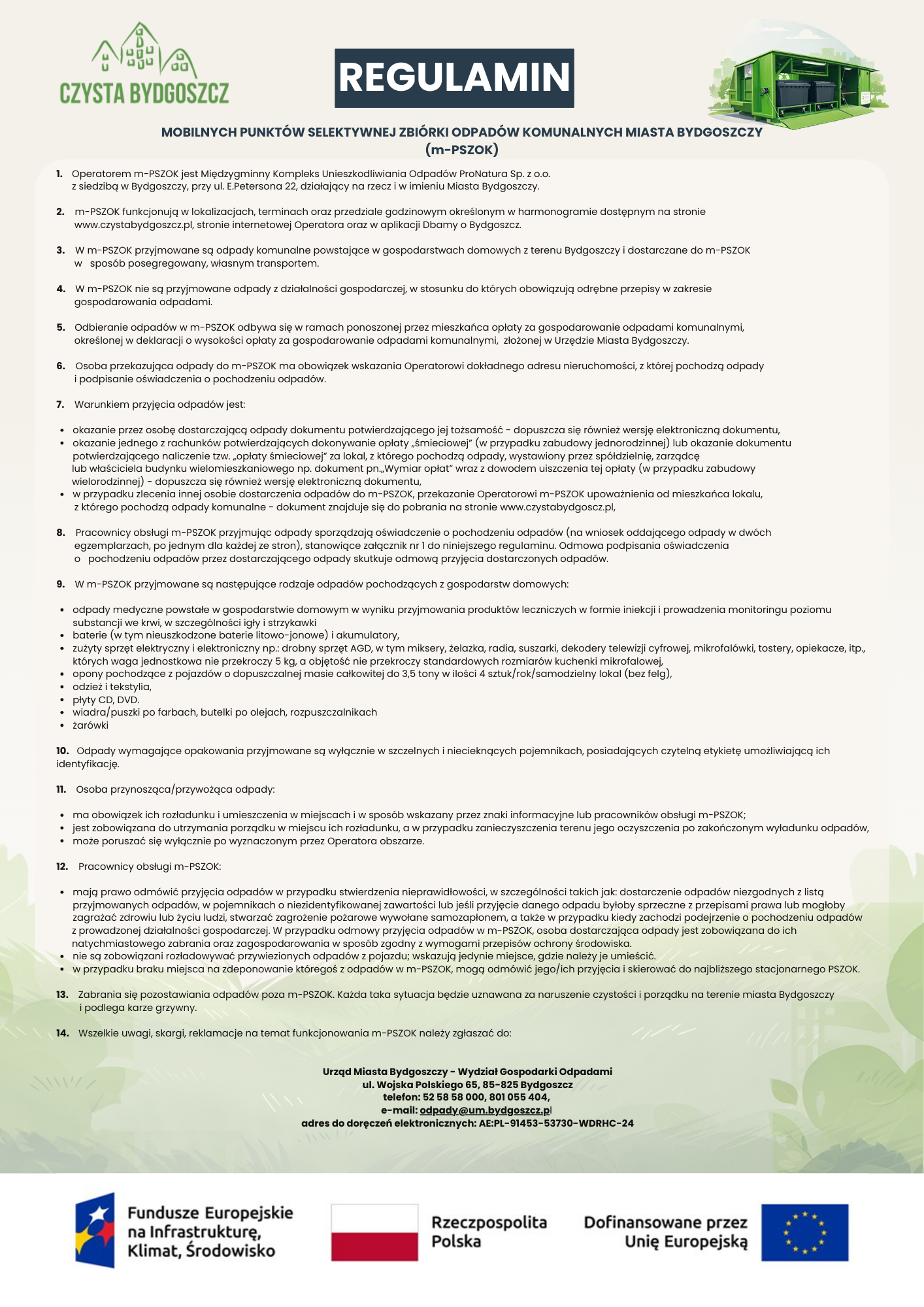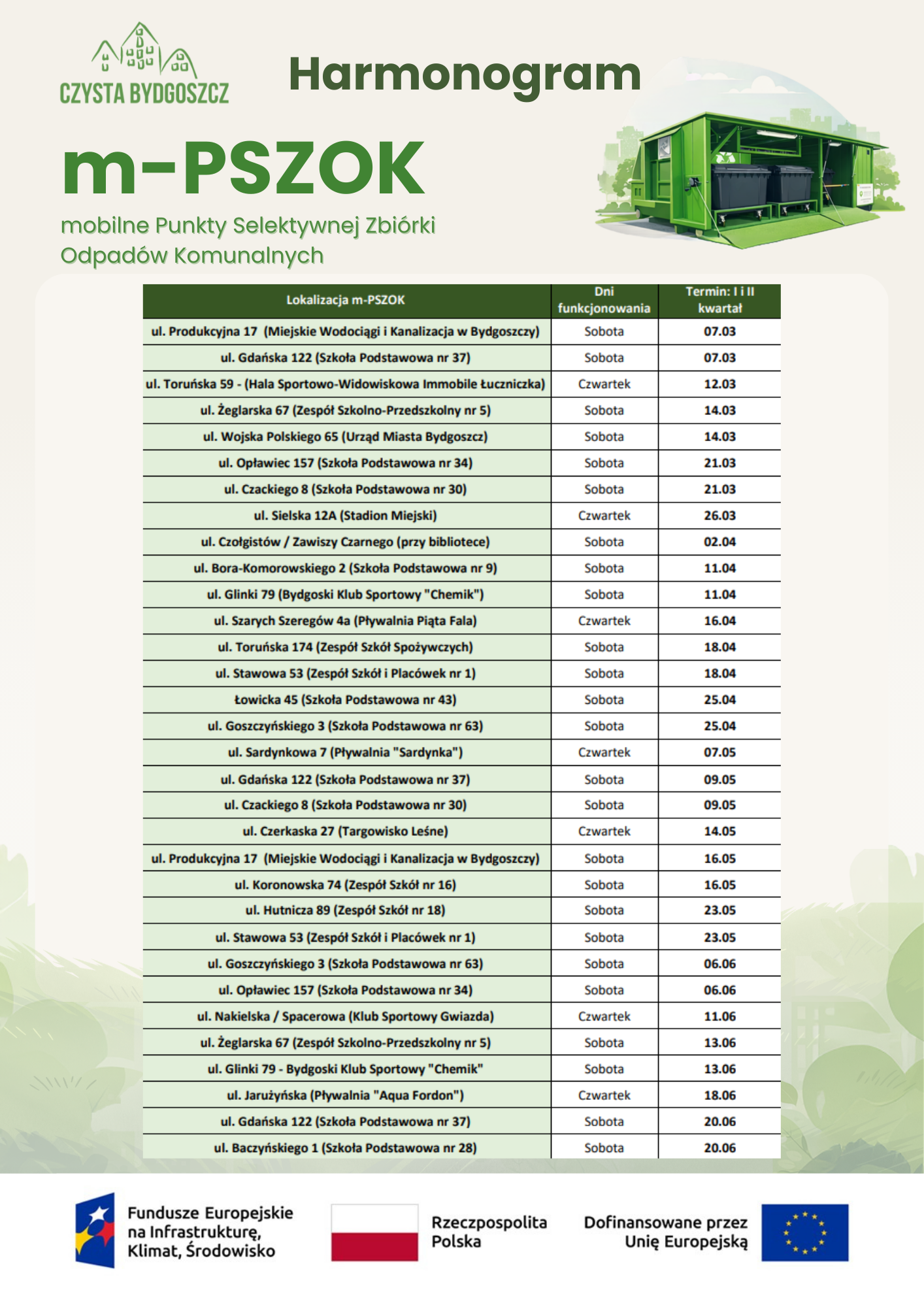 Mieszkańcy Bydgoszczy będą mogli skorzystać z Mobilnych Punktów Selektywnej Zbiórki Odpadów Komunalnych (m-PSZOK). To wygodne rozwiązanie pozwala bezpłatnie oddać niewielkie odpady z gospodarstw domowych, które nie powinny trafiać do zwykłych pojemników.